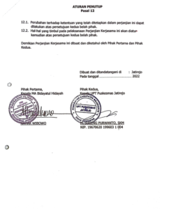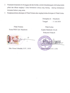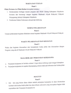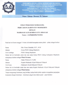 3.Surat Perjanjian Kerjasama Antara Perkumpulan Keluarga Berencana Indonesia (PKBI) Kancab Mojokerto dengan MA Bidayatul Hidayah Mojogeneng Jatirejo untuk Memberikan Edukasi Kepada Peserta Didik MA Bidayatul Hidayah Tentang Bahaya Kekerasan Seksual dan Bullying di Madrasah/Sekolah.