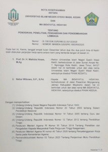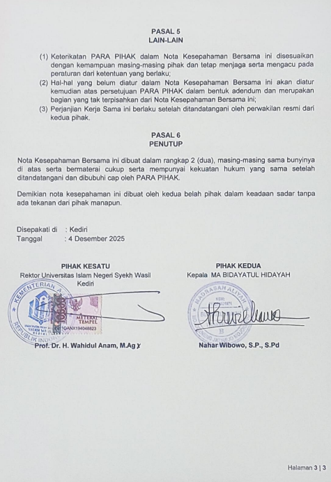 6.Surat Perjanjian Kerjasama (SPK) Antara UIN Syekh Wasil Kediri dengan Madrasah Aliyah Bidayatul Hidayah Mojogeneng Jatirejo Mojokerto Tentang Pendidikan, Penelitian, Pengabdian dan Pengembangan Lembaga. SPK tersebut telah Ditandatangani oleh Kedua Belah Pihak pada Kamis, 04 Desember 2025 pada pukul 16.00 WIB Bertempat di Gedung Spot Center UIN Syekh Wasil Kediri.