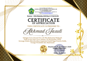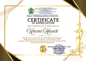 Pada Giat Peringatan Hari Guru Tahun 2025 yang diselenggarakan oleh Madrasah Aliyah Bidayatul Hidayah Mojogeneng Jatirejo Mojokerto, memberikan penghargaan kepada Lima (5) tenaga pendidik favorit yang ditetapkan melalui Surat Keputusan Kepala Madrasah tentang Penilaian Tenaga Pendidik Favorit pada Peringatan Hari Guru hari Selasa, 25 November 2025.  Adapun kelima tenaga pendidik favortit tersebut adalah (1) Akhmad Jazuli, (2) Ummi Hanik, (3) Agus Moh. Taufiqurrochman, (4) Bayu Aditya Pratama dan (5) Indatus Sholikhah.