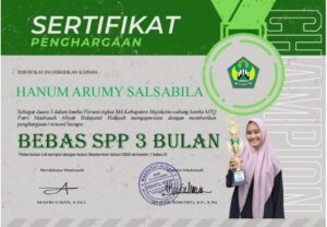 Juara III Cabang Lomba MTQ Putri pada Pekan Olah Raga dan Seni (PORSENI) Tingkat Madrasah Aliyah Se Kabupaten Mojokerto Provinsi Jawa Timur Tahun 2025.